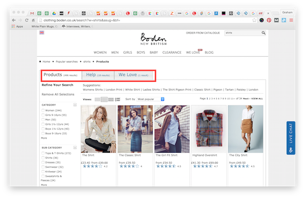 Here, Boden shows non-product results on different tabs. This is a useful way to separate the information out for different types of searchers.