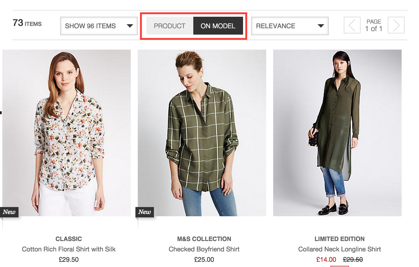 Here, M&S allows users to toggle between different types of product shots. They can view the product on its on, or worn by the model.