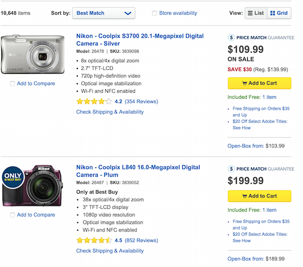 Here, Best Buy shows average review scores in its search results. With so many matching products, this helps a lot.