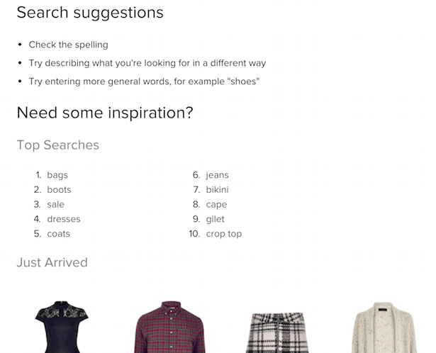 In this case, provide some options. Here, River Island has some advice on searching, then shows its most popular searches and new products.