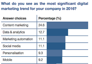 In a poll conducted to accompany the ClickZ Intelligence Digital Trends report, 24.6% of respondents identified content marketing as the key trend for their company this year.