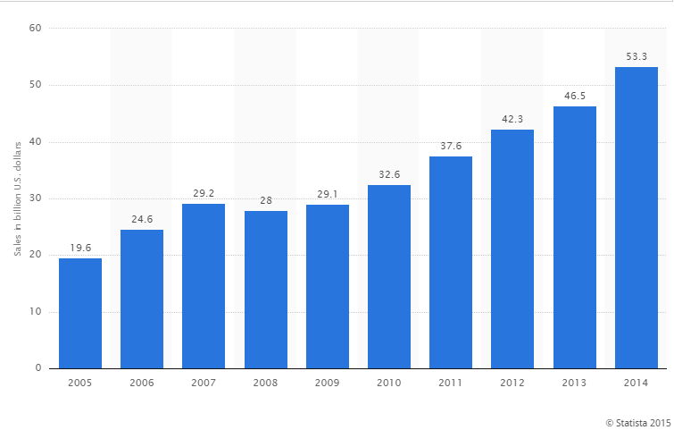 4. According to retail e-commerce sales figures in the US during the holiday shopping season from 2005 to 2014, in 2015, retail e-commerce sales during November and December amounted to 53.3 billion US dollars during holiday season, up from 46.5 billion US dollars in 2013: