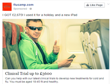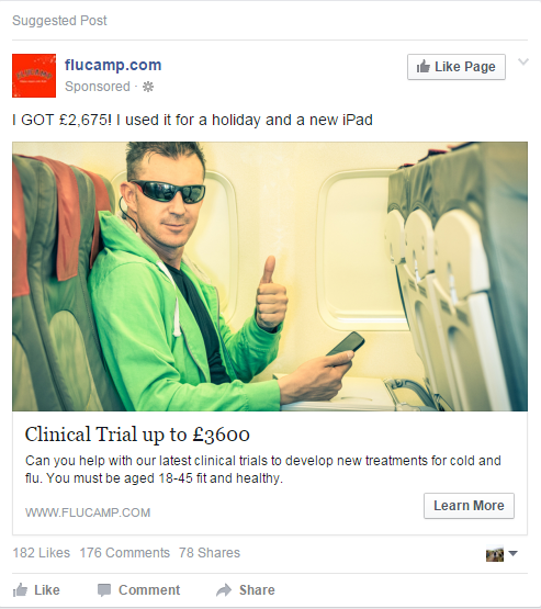 Flucamp – a company that carries out paid clinical medical trials – keeps appearing on my newsfeed, but instead of annoying me like other ‘suggested posts’, I continually find the unconventional way the company communicates with Facebook users extremely engaging and entertaining.