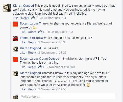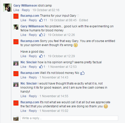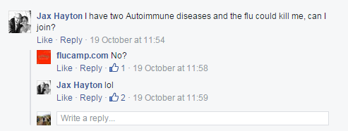 Being sarcastic and witty, of course, isn’t appropriate in every single situation – it comes across as arrogant. Flucamp don’t interact with every single person on Facebook in the same way – they adapt according to user. Mackenzie, for example, seems to know what she is talking about, so flucamp provide helpful answers that aren’t as provocative as others.