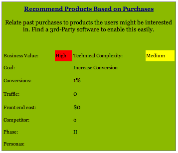 In this version of the functionality matrix, each major idea is also scored with a business goal. Examples of business goals include: increase conversion, increase traffic, increase loyalty, increase brand awareness, or reduce returns. Each goal has an actual metric attached. The increase conversion goal has a percentage attached to it, which is the percentage you feel the feature will increase conversion by. For example, if you are proposing a “people who bought this also bought that” functionality, you might think it will increase conversion by 10 percent. In that case, you would enter either “10 percent” into that field or the calculated number that is 10 percent of your conversion rate (depending on how you set up your math). There is some guesswork involved here; while it’s easy to say that a big idea will increase conversion by 10 percent, it’s more difficult to look at each functional component of that idea and assess its ROI.