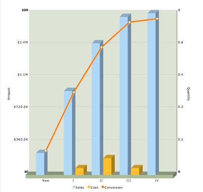 Depending on how you implemented the matrix, you can now create graphs that show a lot of numbers. One important graph we have compares a site’s current traffic, conversion rate, and annual sales with anticipated numbers for phases 1, 2, and 3 of development. The graph shows sales with conversion rate superimposed on it. Other graphs show sales numbers for each phase versus the costs of each phase.