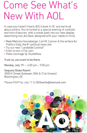 “In case you haven’t heard, AOL’s back in DC and we’re all about politics,” states an invite for AOL’s Cocktail party, to be held tonight at the Sequoia Restaurant on K Street. The event promises attendees a chance to schmooze with writers from AOL’s Politics Daily site, as well as a “sneak peek” at AOL’s self-serve display ad platform, Ad Desk, which the invite goes on to describe as “designed with your needs in mind.”
