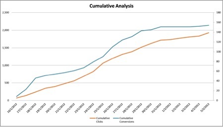 I first looked at the relationship between clicks and conversions in our campaigns. The chart below is typical of what we have observed. It demonstrates a very clear correlation between clicks and conversions over a timeline.