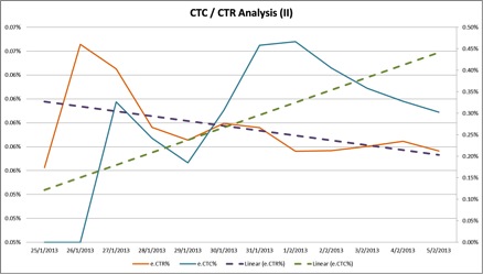 Here is a case (which is not as clear as I’d like it to be) suggesting that the inverse relationship also can exist. Here the data seems to be suggesting that as a CTR declines the CTC improves.