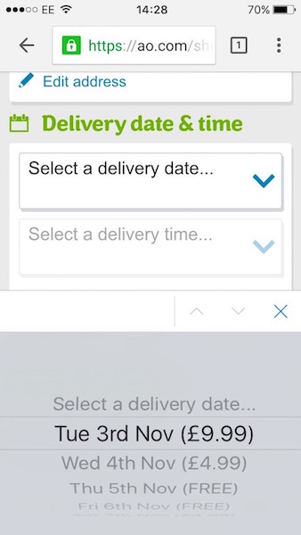 Everybody is fully aware that nominated day delivery comes at a premium, and people are happy to pay for these ultra-convenient services, but don’t hide these prices until we’re right at the end of the journey.