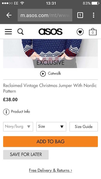 The Asos homepage on a desktop however has a clear ‘free delivery’ message at the top with a link to a list of delivery charges.