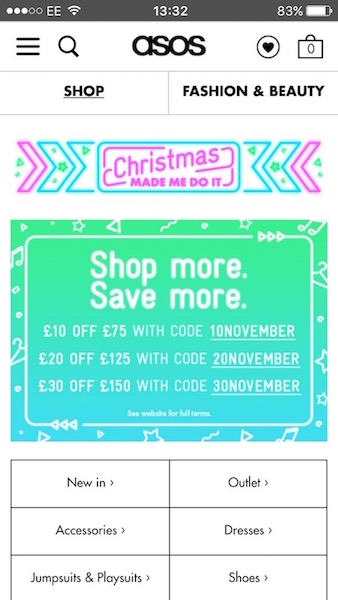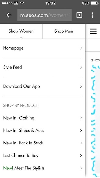 Asos has no mention of delivery options on its mobile homepage or within the menu.