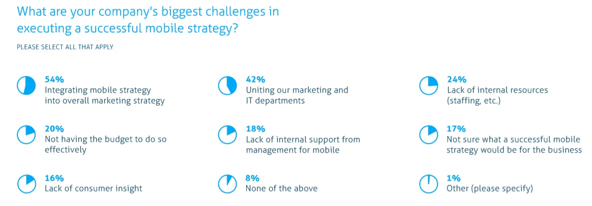 This becomes less surprising when you discover that 42% of the respondents to the study said that their company’s biggest challenge to executing a successful mobile strategy was uniting marketing and IT departments.