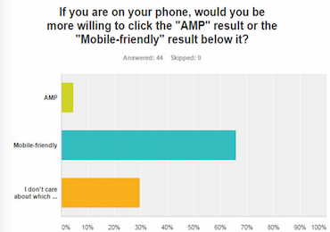 In an effort to test his hypothesis, Gabe created a quick poll that asked respondents if they knew what AMP referred to, and whether they’re be more likely to click on an “AMP” or “mobile-friendly” search result. Not so surprisingly, only three of the 44 people who responded to the poll knew what AMP was, and only two indicated they’d be more likely to click on an “AMP” result compared to 29 who preferred “mobile-friendly.”