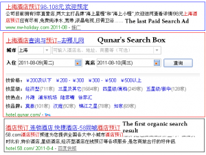 Scroll down half way (i.e., after the first 10 hotel related paid search ads) and you will find Qunar’s hotel search box being embedded. Qunar’s search box is followed by the first organic search result.