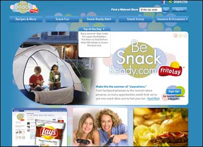 Frito-Lay North America is taking the season head-on with BeSnackReady.com, which currently highlights its many consumer-packaged goods snack products in the context of summer. Launched earlier this year in collaboration with Walmart and being promoted with banners on sites like Shutterfly.com, the microsite was built to give moms value and a convenient place where they can plan activities with family and friends. As such, it features recipes with a focus on grilling and entertaining, lifestyle tips, polls, product coupons, and links to outdoor products on Walmart.com.