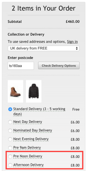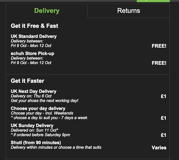 Delivery options in general are very important to Schuh, with Next Day being one of the most important. Of course, a fast, reliable and (most importantly) free standard (2-3 days) offering is going to be our highest volume service.