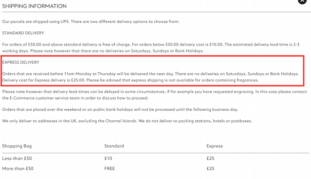By contrast Mont Blanc offers express delivery. After all, if people are prepared to pay more than £400 for a pen, they’ll pay a little extra for express delivery. If its a gift they need quickly, this gives Mont Blanc an advantage.