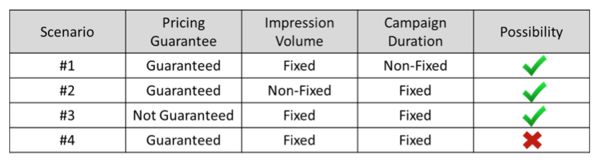 While the above three scenarios are possible, the fourth and final scenario in essence, is impossible to guarantee. One of the three constraints has to be variable/non-fixed within an RTB campaign, otherwise it is simply impossible to execute.