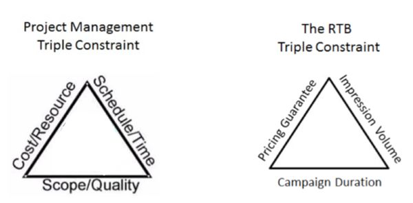 The triple constraint is applicable to all RTB formats. For example, in SEM we would never expect a fixed cost per click (CPC) and a set number of clicks all within a specific time.