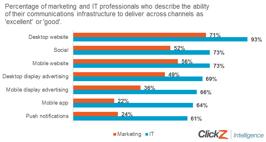 The research also looks at the ability of tech infrastructure to deliver across a range of marketing communications channels, with IT respondents and marketers both asked to rate performance.