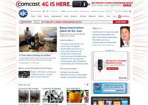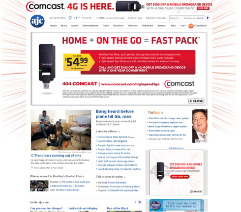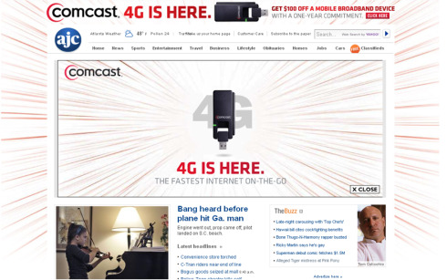 Comcast on Wednesday ran its second test in 15 days on the package deal to promote its 4G mobile broadband product to tech-savvy Atlantans. The initial test ran on March 30 and was the telecommunication brand’s first attempt at using a re-skin on a newspaper site. A strong click-through rate encouraged Comcast to order another day even though retail results from the initial test weren’t in, said Larry Schweber, a VP of marketing communications for the telecom’s Cable Southern Division.