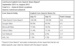 Concurrently, 18.7 billion explicit core searches were conducted in September. While Google continues to take the largest slice of this pie with 12.5 billion of these queries taking place through its sites, the search giant saw a 2 percent drop over the previous comparable month where almost 12.8 billion queries were conducted.