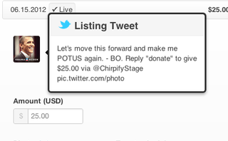 So, the company aims to give them an incentive to partner. Its Tweetelection microsite launching today will let people donate via tweet. There’s one caveat: in order for the campaigns to receive the donations they must partner with Chirpify. Until they do, donation payments will only be recorded, not actually be processed.