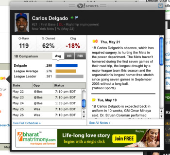 Not exactly. The manager of the fantasy team “The Sleazy Uncles” told me he’s been seeing ads for some strange stuff lately when researching players. Yeah, he’s getting ads from typical remnant inventory advertisers like Vonage. But he’s also seeing a lot of ads for Indian marriage and Russian mail-order bride services.