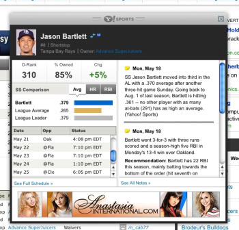 Yahoo’s fantasy baseball service and player stats pages provide a ton of ad inventory, and I can’t help but wonder whether the company sells any of it direct to advertisers. It seems to be a great way to reach those ever-elusive young males, right? You’d expect to see ads for Axe deodorant or some new 8-blade razor or something, right?