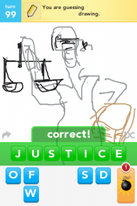 Draw Something is simply Pictionary for iPhones. Two players take turns to visualize words thrown up randomly by the app and guess what the other player has drawn. Letters are provided as clues. Each correct guess gives both players coins, which are exchanged for more colors to draw with.
