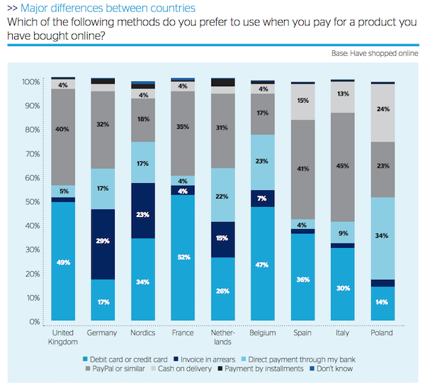 While in the UK, it’s mainly about credit and debit cards, and PayPal to a lesser extent, payment preferences vary from country to country.