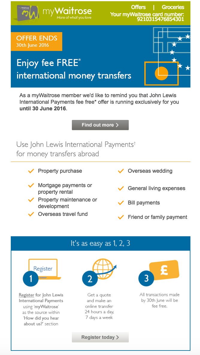 Waitrose wanted to promote the free international money transfers for its members, but it also wanted to ensure that they are not confused and that’s why it sent a very clear and helpful email, also mentioning at the bottom how easy the process is.