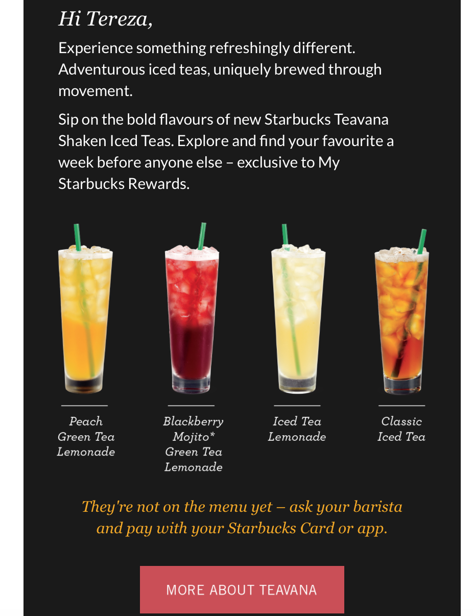 Starbucks has its own loyal audience, but this is not always enough to maintain the engagement. Thus, rewards and previews are appreciated, like the recent email which allowed Starbucks members to try out the new iced teas a week before their actual availability for the other customers.
