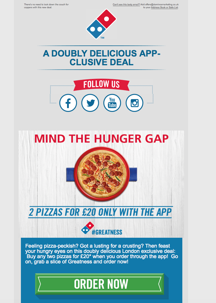 Domino’s wanted to promote its deal (and its app) and so it created an appealing email, adding value in the most direct way. There’s no need to add more options, or to confuse the recipients, and that’s what makes an effective email campaign.