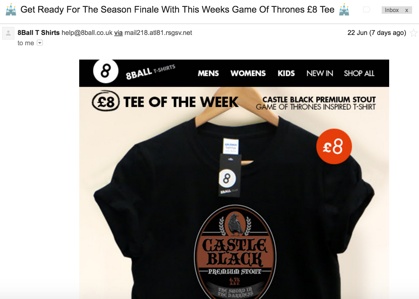 Except for the frequency, relevance may also increase the effectiveness of an email, and 8Ball is an example of how ecommerce may embrace a TV moment to increase its sales.
