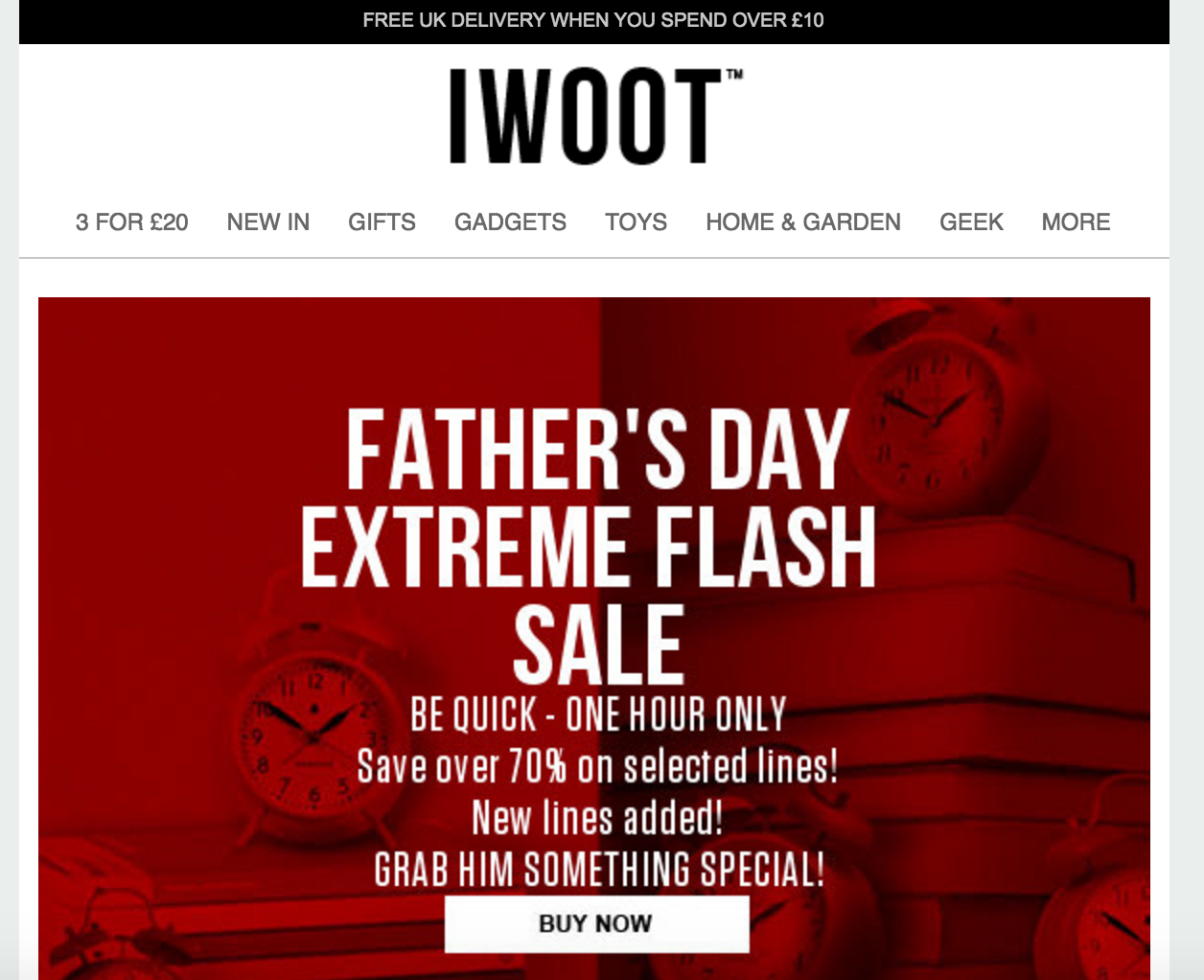 Email campaigns are frequently affected by holidays and big events, with IWOOT promoting a sale for Father’s Day, also triggering the sense of urgency to encourage purchases.