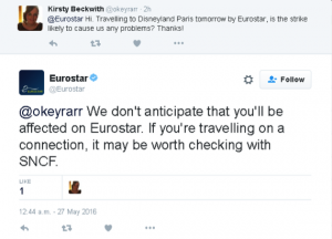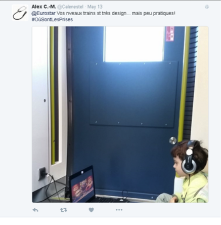 For example, Eurostar customer Alex complained on Twitter about the lack of electric plugs for his child’s laptop.