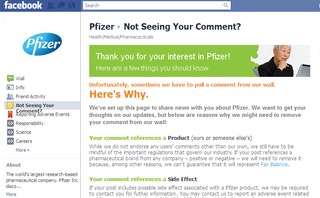 “Now that you can respond to our posts, please know that we may sometimes need to remove a comment. Click on the ‘Not Seeing Your Comment?’ link on the left to learn why. Thank you for visiting us!” wrote Pfizer on its corporate Facebook page on Monday. The company also added a new “not seeing your comment?” tab on the left-side page navigation.