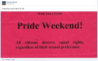One item in particular stands out on the RomneyRecord page, which allows owners to increase the size of posts they want to make more prominent. The 2002 timeline post encompasses the width of the page, and displays a bright pink flyer wishing people “A Great Pride Weekend.”