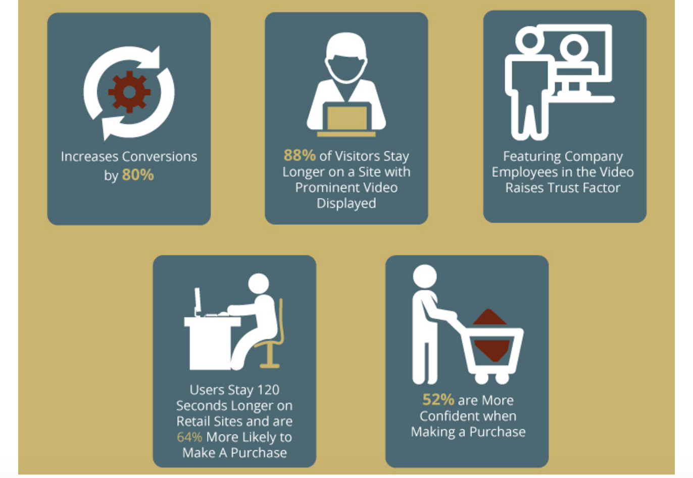It has been observed that video can increase conversions up to 80%, while 88% of visitors will stay longer on a site that showcases the right video.
