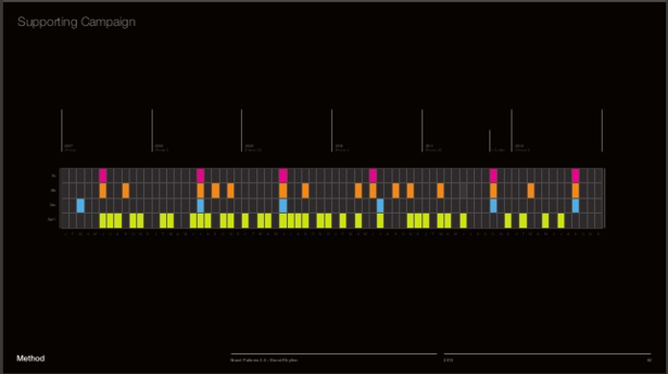 The top pink line is the product launch points for each model of iPhone. The second line of orange points represents software launches. The third line of blue points represent unique campaigns. The final line of yellow points represent supporting marketing campaigns.