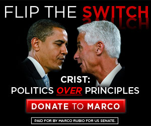 More recently the Rubio campaign itself has used a similar photo of Crist and Obama, suggesting that supporters donate and “Flip the Switch” on Crist, whom the ads claim puts “politics over principles.” The Flip the Switch campaign aimed to recruit 2,400 donors – 100 for each of the 24 years Crist “used the GOP to get elected.” While ads from the Senate Conservatives Fund, which has given thousands of dollars to Rubio’s campaign this year, have similar messaging and imagery to some Rubio campaign ads, Targeted Victory said the two do not work together on advertising.