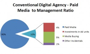 Remuneration. The remuneration of agencies on the conventional side of the business has been under debate for decades, in digital the same has become much more complicated. In conventional media, the input can be monitored and controlled. For example, if the agency does not do the messaging right, it can be reworked until it is perfect, thus one needs to put a lot of emphasis on the negotiated price. In digital it is almost impossible to monitor or control input. Let’s take an example of paid search, which is probably 60 percent-plus of all digital spend. An agency can charge 6 percent of spend and make more money from the client or charge 13 percent of spend and end up having a lesser margin. The advertiser finds it almost impossible to control the quality of technology, personnel deployed, and the number of man-hours invested in optimization. I am sure all of us have seen campaigns that were managed for a lower fee but ended up wasting four times as much of media cost due to inefficient optimization. The advertisers must realize, if the agency is honest and actually deploys the extra revenues into further optimization of the campaign, each 1 percent extra may lead to 3 percent savings in media cost. In most conventional mediums, the investments made in ad units, media buying, and other incidentals are less than 10 percent of paid media, while in digital the paid media to management ratio can be as much as 30 percent of paid media. I am not saying pay 30 percent to the agency, but provide budgets for content creation, analytics, multivariate testing, technologies, number of ad units, etc. This 30 percent investment would lead to the remaining 70 percent of the budget delivering more returns than 90 percent of paid media investments would have given you.