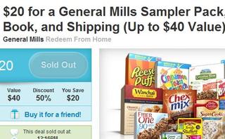 General Mills became the first CPG brand to test the daily deals platform, asking $20 for $40 worth of breakfast cereal, snacks, cookie mix, canned corn, and Hamburger Helper. Such items are part of the 90-year-old giant’s “General Mills Sampler Pack,” which was accompanied in the Groupon offer by a coupon book worth $15. The pitch also included free home delivery.