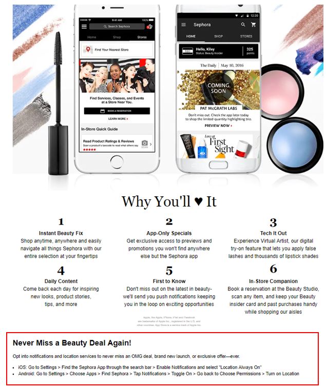 Here’s a closer look at the text promoting the Sephora App’s in-store companion which reads, “Opt into notifications and location services to never miss an OMG deal, brand new launch, or exclusive offer–ever.”