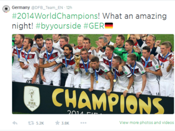 Substitute goal scorer Mario Gotze was the most mentioned player in the German squad after clinching the winning (and only) goal whilst Lionel Messi inevitably claimed the title for the Argentinian side. Following the match German players took to the micro blog to share selfies of themselves celebrating on the pitch, posing with the famous golden trophy.