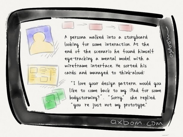 Per Axbom’s UX Joke: A persona walks into a storyboard looking for some interaction. At the end of the scenario, he found himself eye-tracking a mental model with a wireframe interface. He sorted his cards and managed to think-aloud: “I love your design pattern, would you like to come back to my iPad for some bodystorming?” “Sorry” she replied “You’re just not my prototype.”