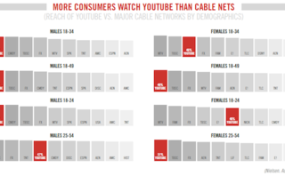 According to the latest issue of YouTube Insights, which was published in October 2013, more consumers watch YouTube than the major cable TV networks. Ironically, the chart below is based on Nielsen data.