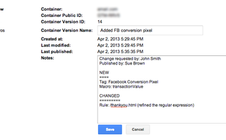 Whenever a new container version is published, you are given the opportunity to name the container version and add notes. You should take advantage of this facility to leave full notes for someone who may be auditing your site’s tagging or troubleshooting your changes at a later date.